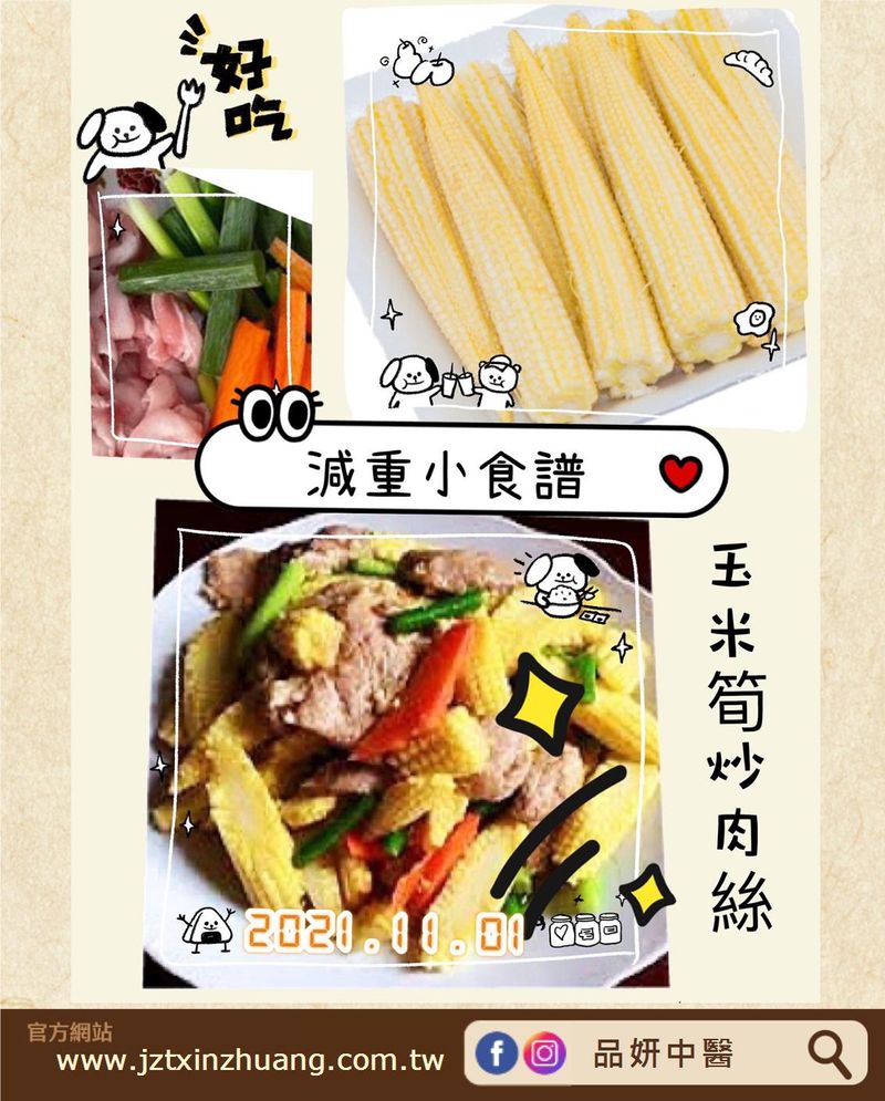 熱鍋下一匙油,油熱後下五花肉片,肉片炒白後,下蒜跟蔥,炒出香氣,下玉米筍跟胡蘿蔔絲,翻炒均勻。