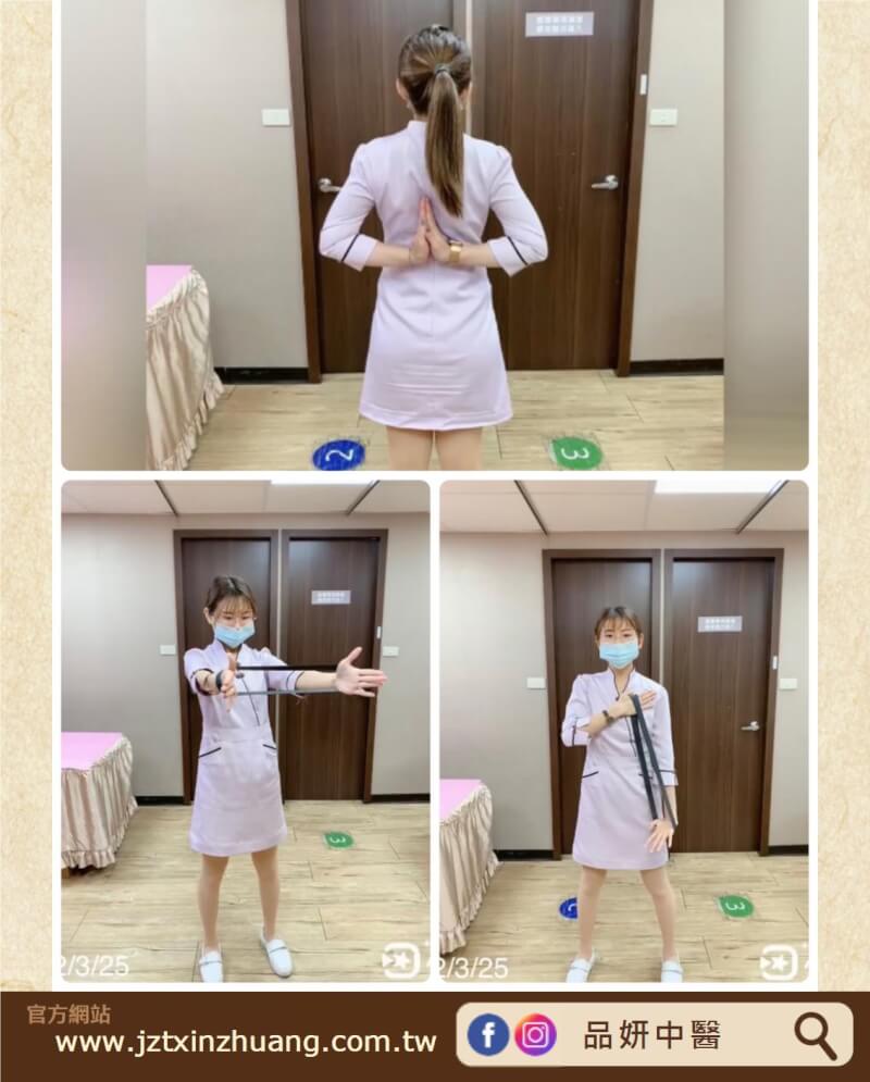 2.彈力帶訓練(一):雙手套在手腕上,雙手掌心相對,雙腳與肩同寬,往外打開重複15-20次