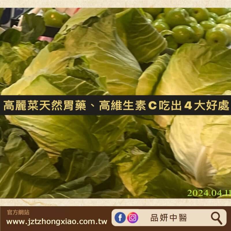 高麗菜又有天然胃藥的封號。高麗菜膳食纖維可以促進排便,還有所含的維生素K具有凝固血液的功效,另外更富含維生素U這種抗潰瘍因子,可以促進胃的新陳代謝、及黏膜修復,這些營養素都被認為能夠預防胃潰瘍和十二指腸潰瘍。
