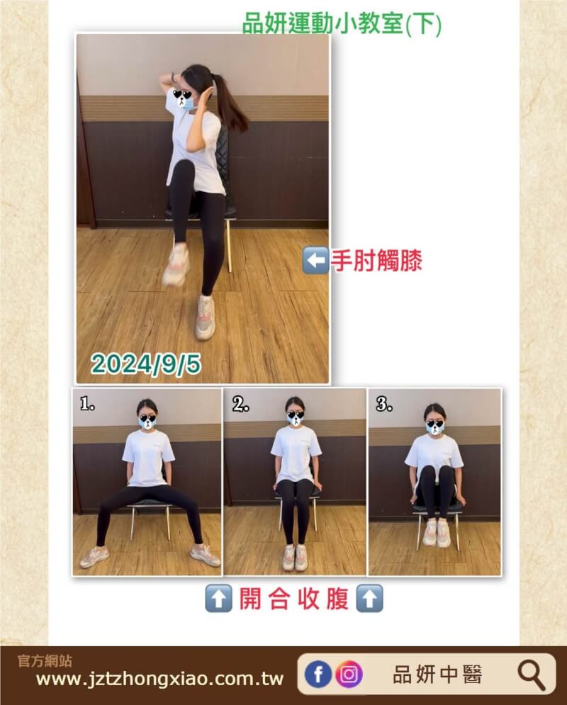 2.開合收腹-椅子坐一半,腰背挺直雙腳向外張開.收回,雙膝提起腹部發力向上抬,三個動作完成為1組