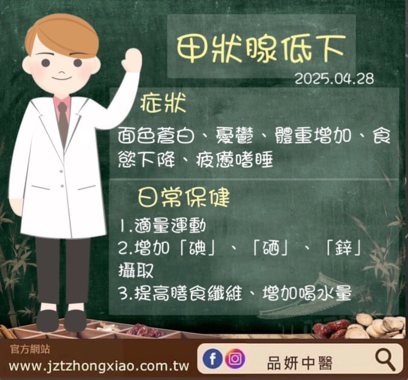 甲狀腺低下常見症狀為疲勞嗜睡體重增加等,中醫觀點與陽虛、臟腑失調及內因外因進行調養,以溫補方式補氣滋腎等加以改善,也可搭配針灸進行調理。
