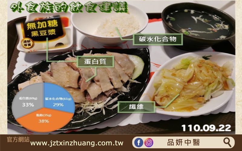 「白飯減半,降低碳水的比例,喝豆漿增加蛋白質攝取,這兩個觀念不錯,再把雞皮去掉降低脂肪攝取會更好。套餐的高麗菜份量不足,可再加一份超商的生菜沙拉或水果,拉高纖維攝取量」